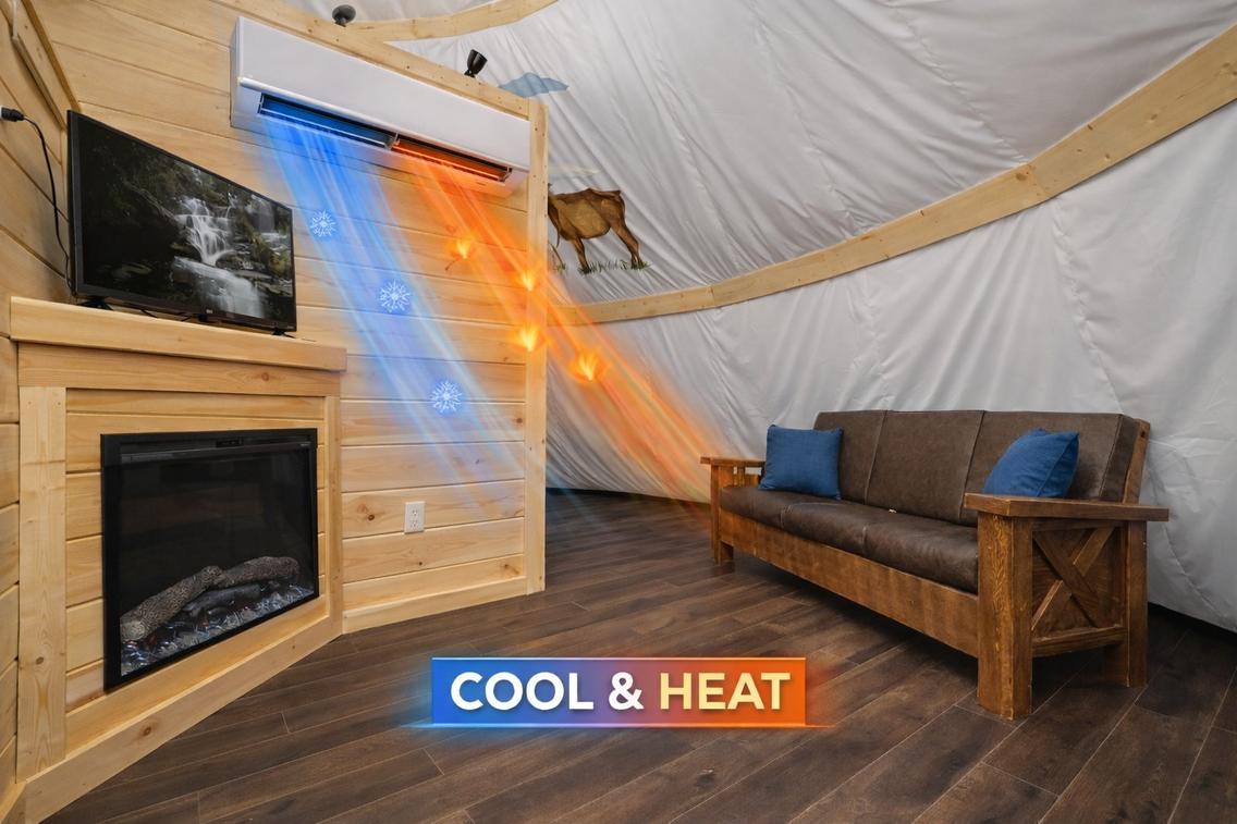 This wonderful tepee is perfect for families and loved ones. It is complete with a queen bed and twin bunk beds, mini split air conditioning, an electric fireplace, wireless internet access, a flat-screen TV, a full bathroom, pool access, access to an 18-hole putt-putt course, hiking trails, and other Parkside Resort amenities.
