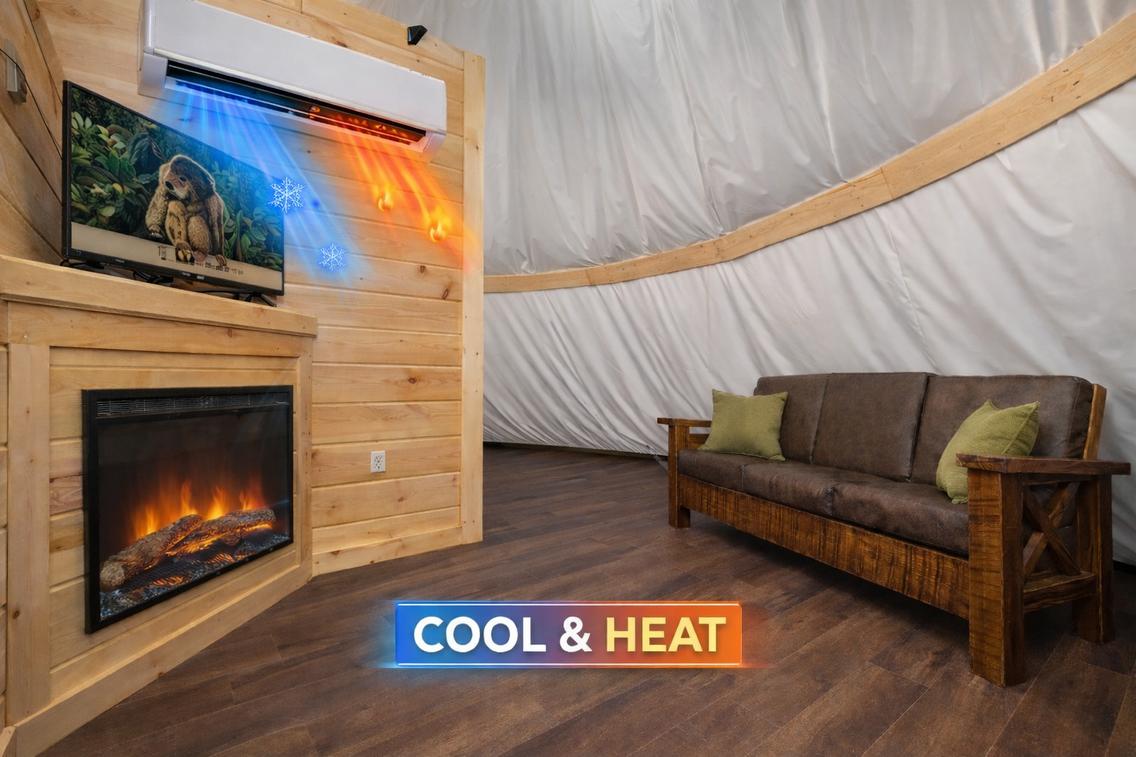 This wonderful tepee is perfect for families and loved ones. It is complete with a Queen bed and Twin bunk beds, mini split air conditioning, an electric fireplace, wireless internet access, a flat-screen TV, a full bathroom, pool access, access to an 18-hole putt-putt course, hiking trails, and other Parkside Resort amenities.