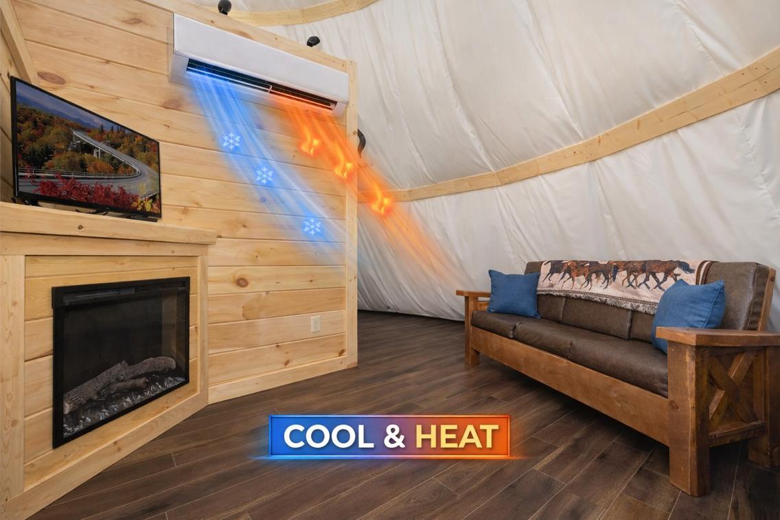 This wonderful tepee is perfect for families and loved ones. It is complete with a Queen bed and twin bunk beds, mini split air conditioning, an electric fireplace, wireless internet access, a flat-screen TV, a full bathroom, pool access, access to an 18-hole putt-putt course, hiking trails, and other Parkside Resort amenities.